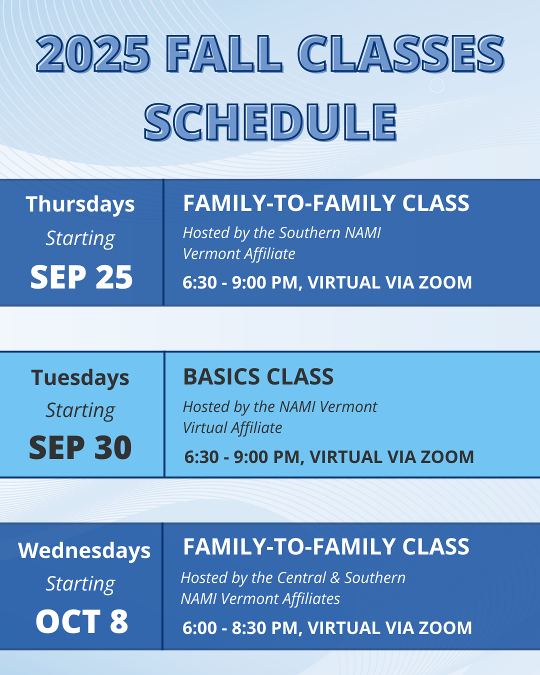 Are you looking for more information about a loved one’s mental health condition? What about guidance on how to care for yourself while also supporting them? NAMI Vermont is offering two great programs for you this fall: Family-to-Family and Basics.